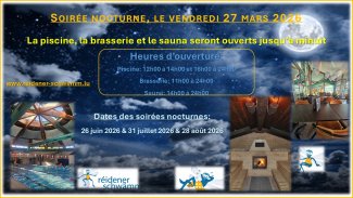 Le vendredi 27 mars 2026, la Piscine de Redange invite petits et grands à profiter d’une nouvelle soirée nocturne placée sous le signe de la détente et du bien-être. À cette occasion, la piscine, la brasserie et le sauna resteront exceptionnellement ouverts jusqu’à minuit.