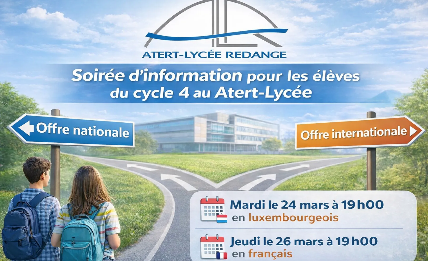 Dans le cadre du passage du fondamental au secondaire, la direction de l’Atert-Lycée organise en collaboration avec la direction de l’enseignement fondamental de la région Redange une réunion d’information destinée aux parents d’élèves du cycle 4. Cette rencontre a pour objectif de vous fournir toutes les informations nécessaires sur les différentes offres scolaires proposées au sein de l’ALR et l’offre internationale dans d’autres lycées.