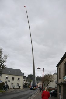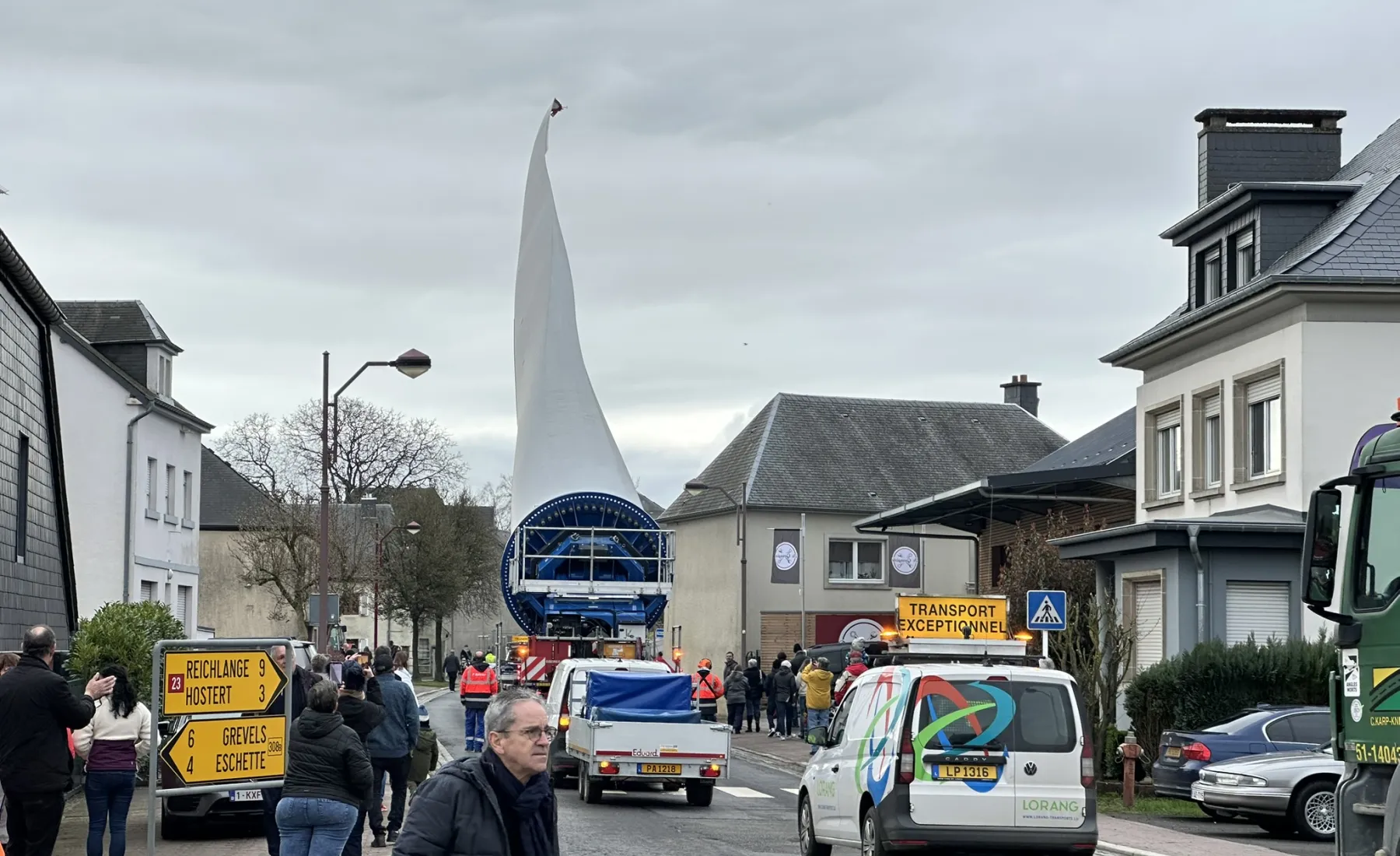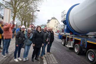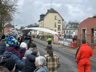 En cours de route – notamment dans les virages – la pale a dû être relevée puis repositionnée avec une grande précision à plusieurs reprises afin de garantir la sécurité du transport. De nombreuses personnes se sont rendues à Rambrouch, près de la commune, pour assister à ce spectacle, qui a été accompagné d’un moment convivial avec nourriture et boissons.