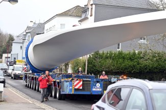 Le 17 mars, l’une des trois pales de l’éolienne de Folschette, entreposée temporairement au Wäissenhaff, a été transportée vers son emplacement définitif près de Folschette.