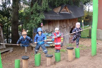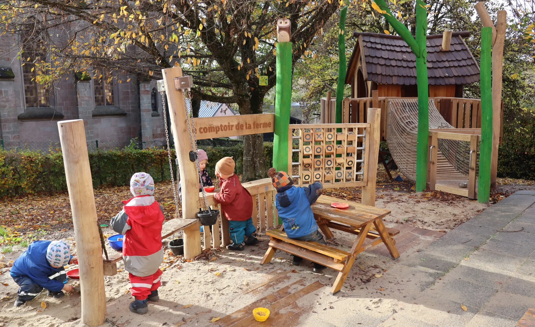 D’Spillgeräter si gréisstendeels aus robustem, natierlechem Material a fërderen d‘Bewegung, d‘Kreativitéit an d‘Zesummespill.